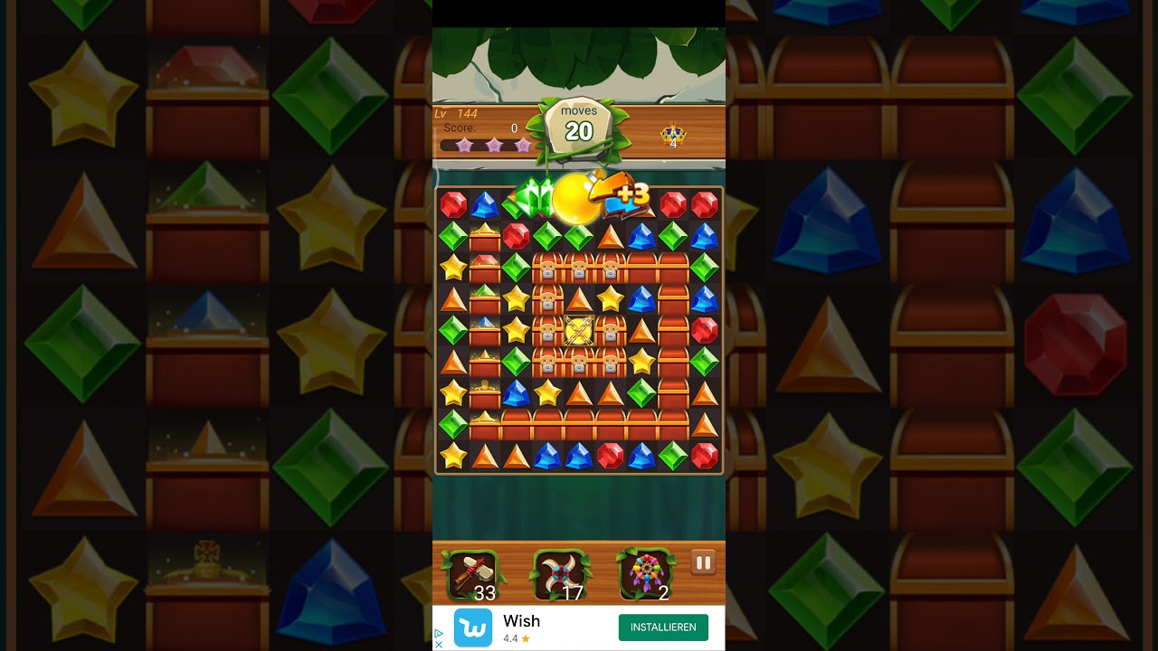 Here you see Stage 144 of the game Jewels Jungle (a three wins game), which you can play an app game for example on Android or directly on Facebook.