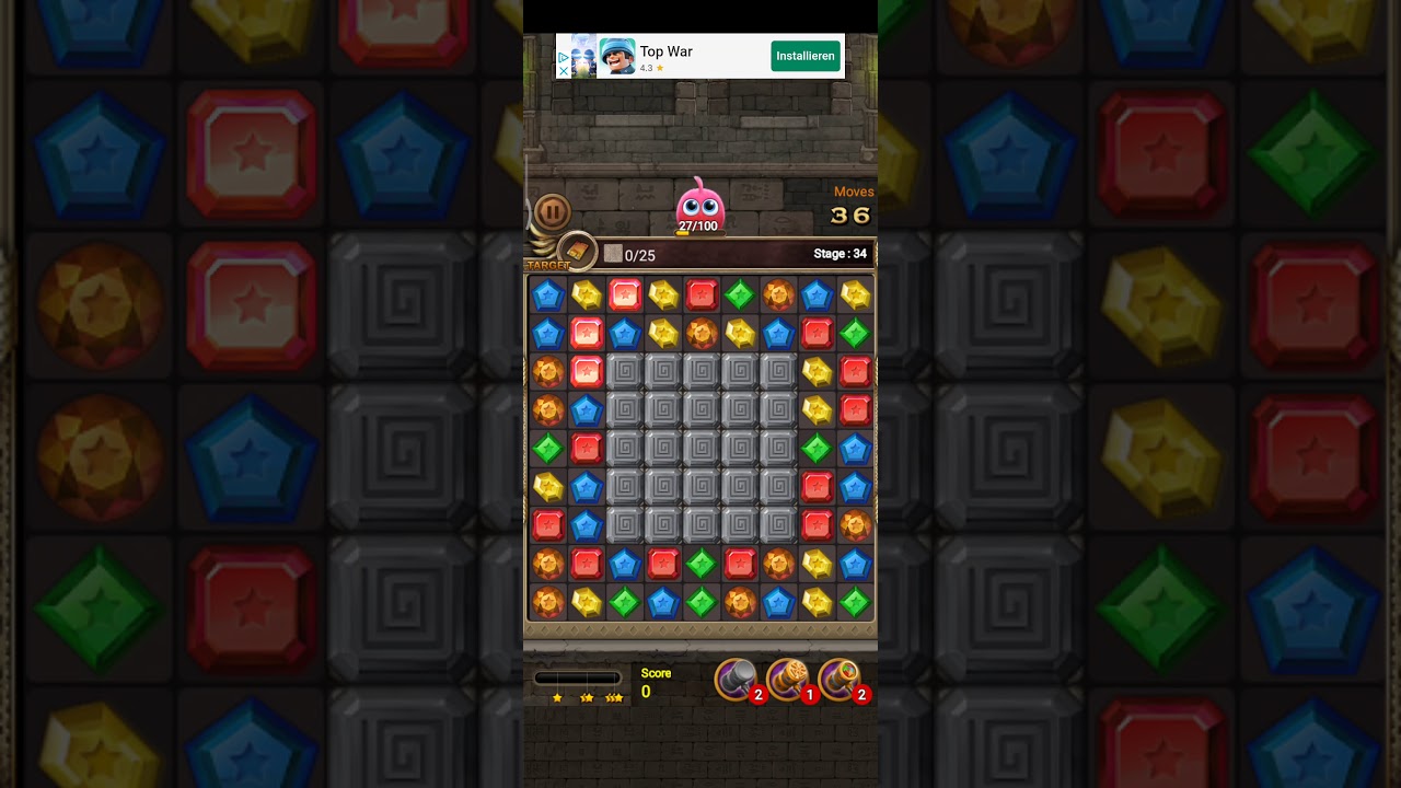 Here you see Stage 34 of the game Jewels Temple-Quest (a three wins game), which you can play an app game for example on Android or directly on Facebook.